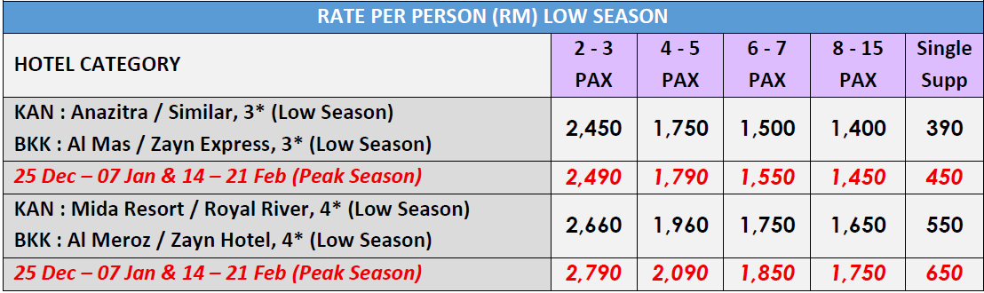 - Public holiday / Peak season surcharge may apply upon booking confirmation.
