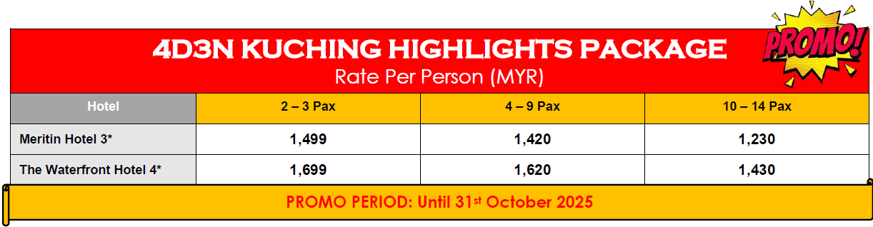 Pakej percutian Raha Holidays merangkumi perancangan itinerari, penginapan dan aktiviti yang membuatkan pelanggan tidak terasa terikat dengan pakej kami semasa pecutian. Biarkan Raha Holidays merancang perjalanan percutian anda dan memastikan anda akan mendapat pengalaman percutian yang menyeronokkan. Itinerary trip Kuching City tour kami telah susun dengan rapi dan kemas supaya anda lebih seronok sepanjang Kuching Sarawak travel, tour and holiday package anda.