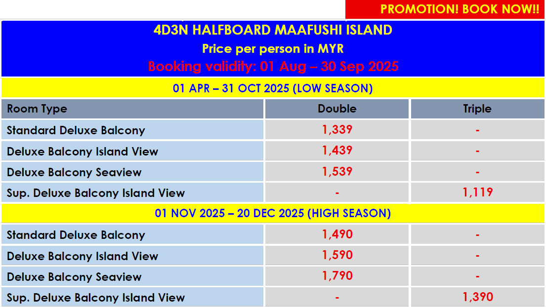 - From Male Airport – 09:15am, 13:15pm, 17:15pm ONLY.