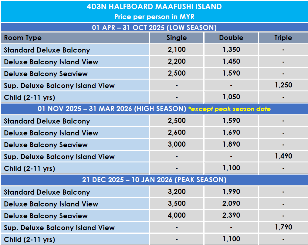 | 01 NOV 2025 – 31 MAR 2026 *Except peak season | 500 | 590 | |