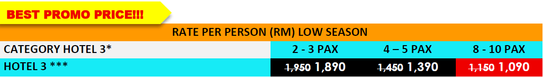 - Additional Surcharge RM70/per pax for peak period on 12 – 15 Apr 2025.