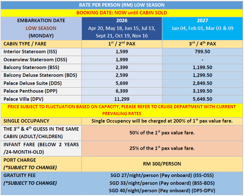 - Booking is subject to cabin availability and capacity controlled. Also based on first come first served basis upon final confirmation.